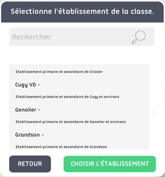 - Implémentation d’une fonction de recherche dans les établissements qu’il est possible de sélectionner lors de la création de la classe.