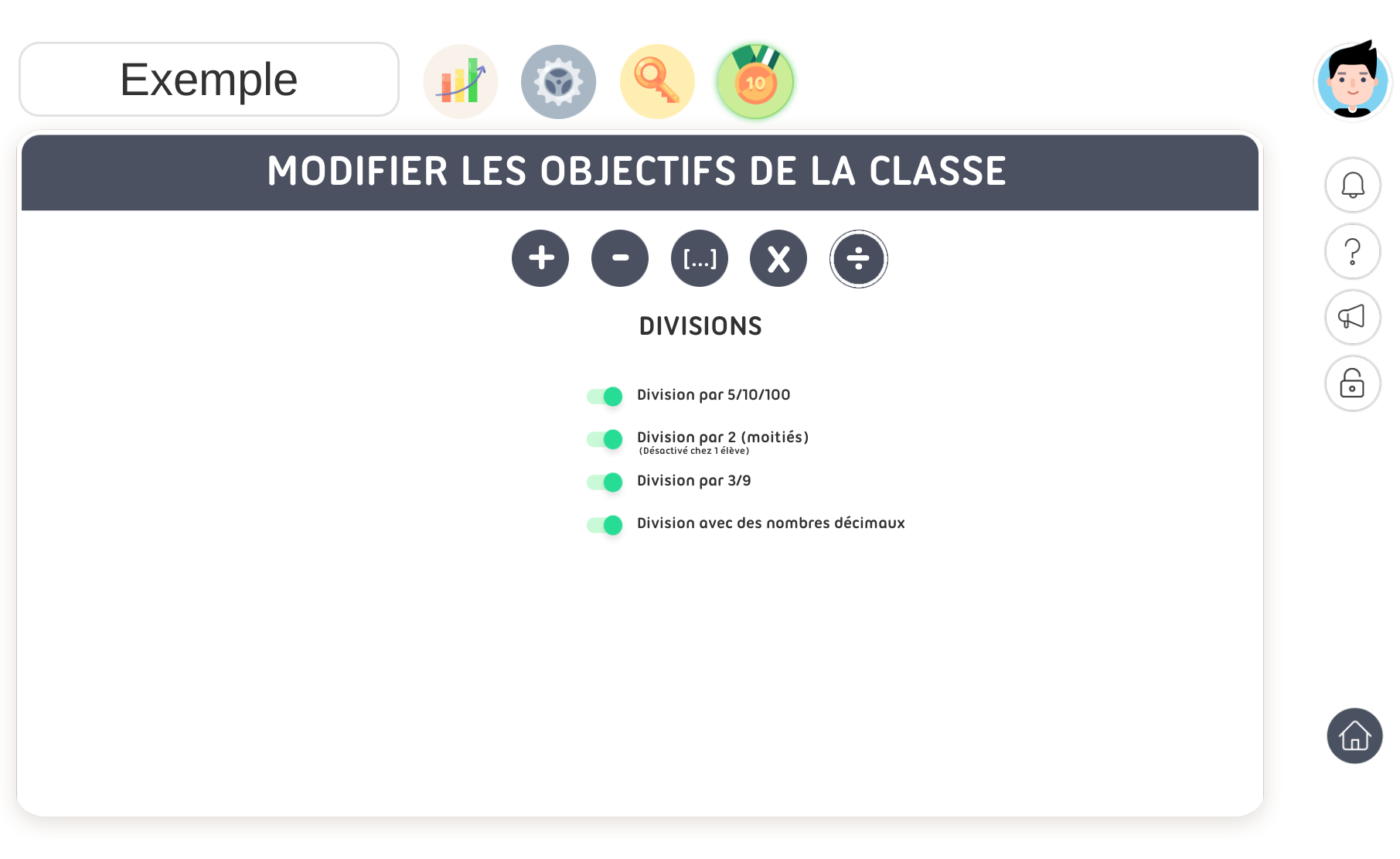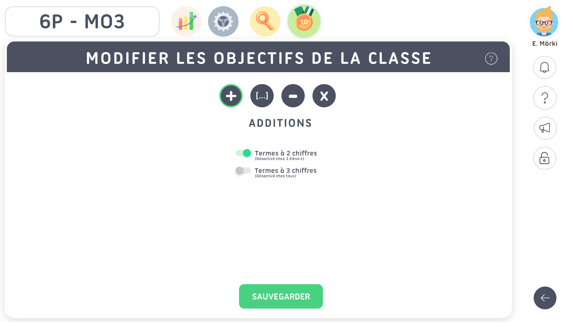 - Désactiver un type de calcul pour toute la classe ou un élève à la fois ne fonctionnait pas pour les additions et soustractions pour les degrés 4H, 5H et 6H. Le bouton restait bloqué.