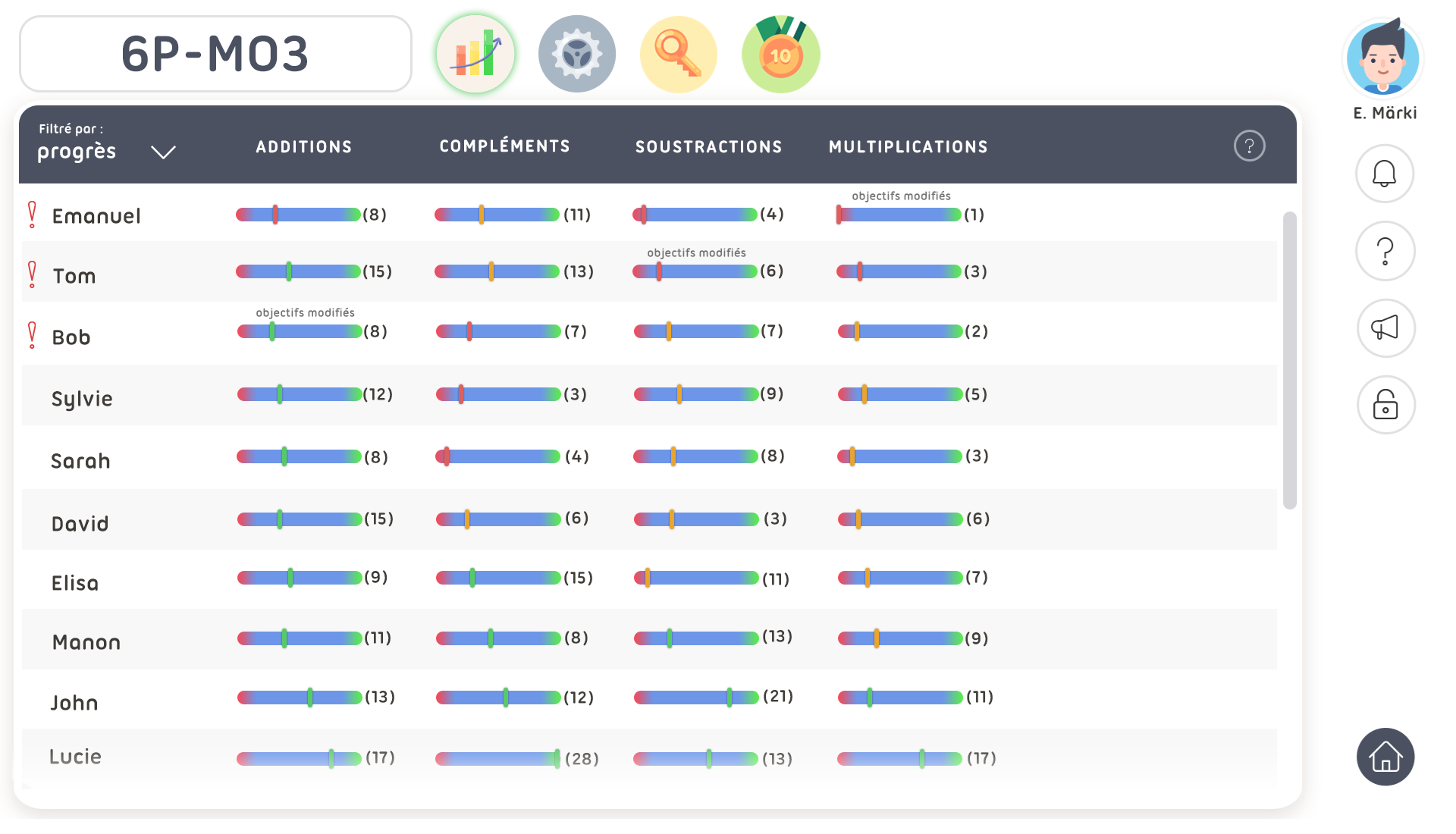 Pour la prochaine mise à jour, nous allons modifier les comptes parents. L’idée est de donner à tous les parents qui utilisent Mathano à la maison, comme pour les enseignants, accès aux informations de progression des enfants. Voir les erreurs, voir la progression pour chaque opérateur et le progrès effectué sur l’année scolaire en cours.