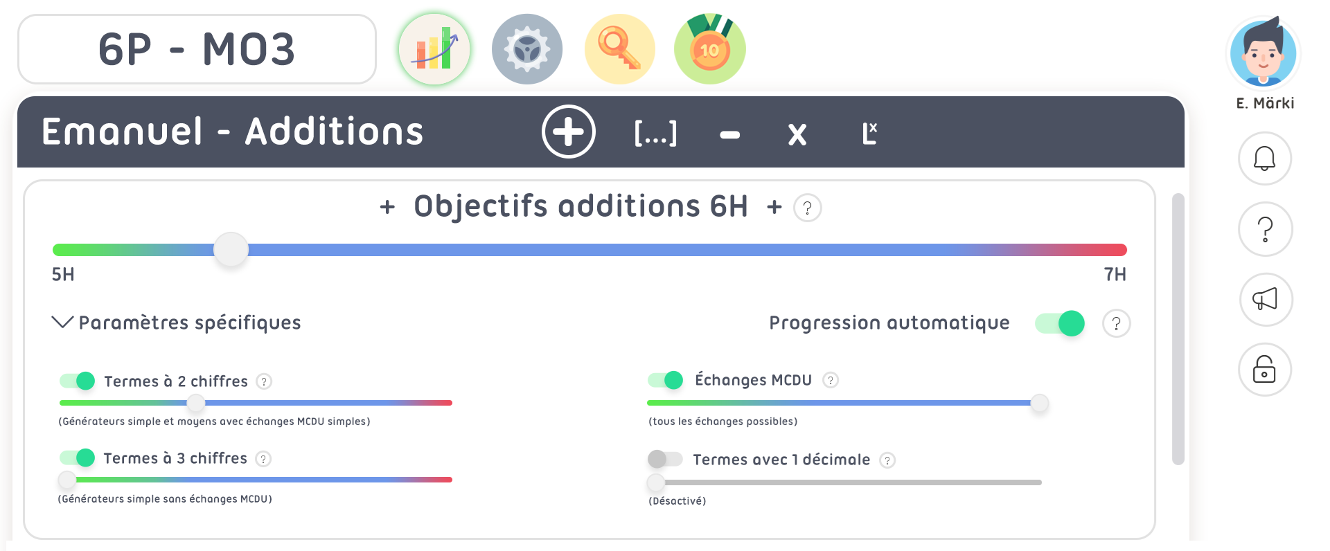 - Les générateurs des additions évoluent en fonction du taux de réussite de l’élève.