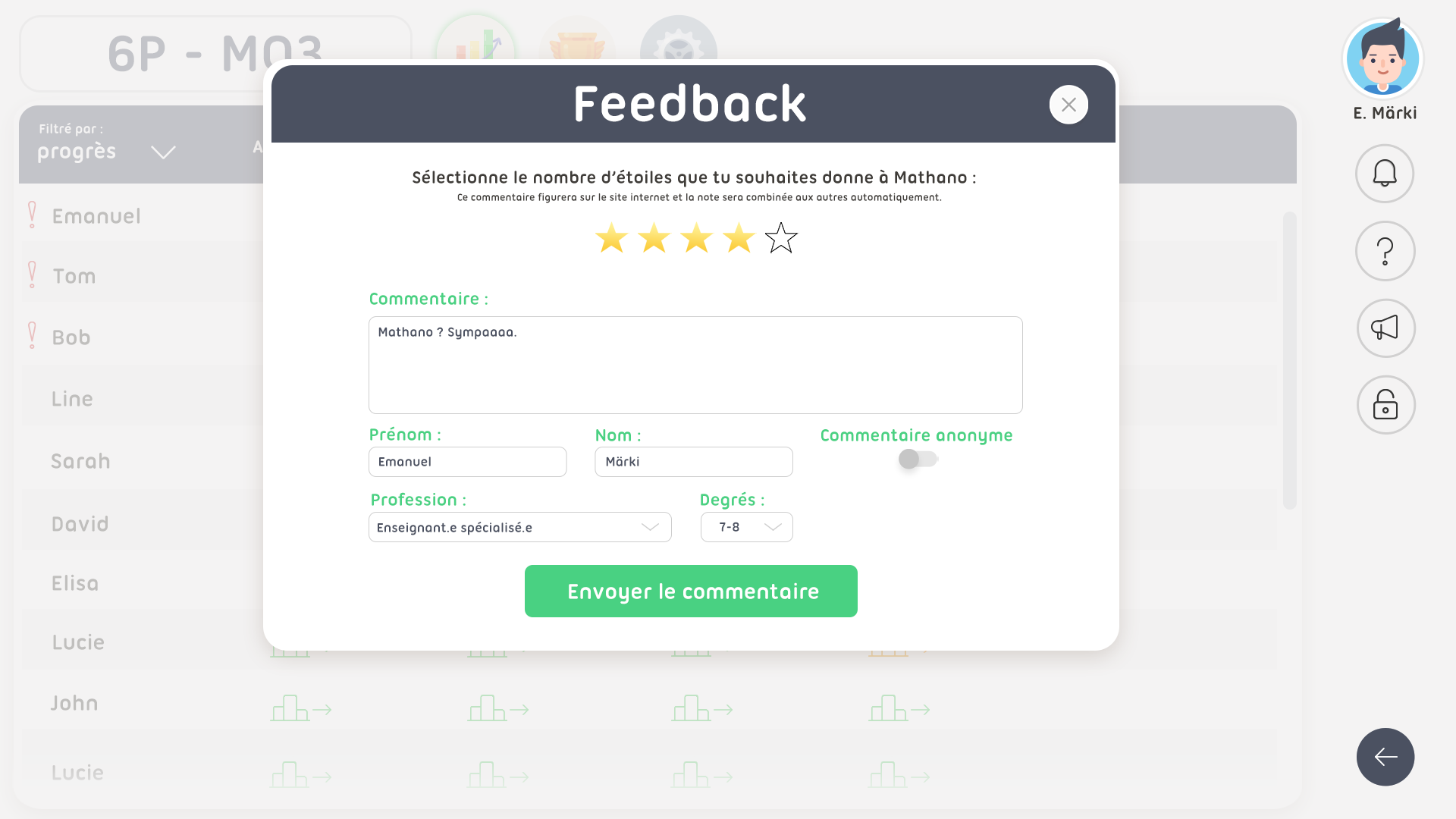 N’hésitez pas à nous communiquer vos remarques et les retours des élèves. Nous essayons d’être à l’écoute autant que possible pour que l’application soit la plus proche possible des besoins réels du terrain.