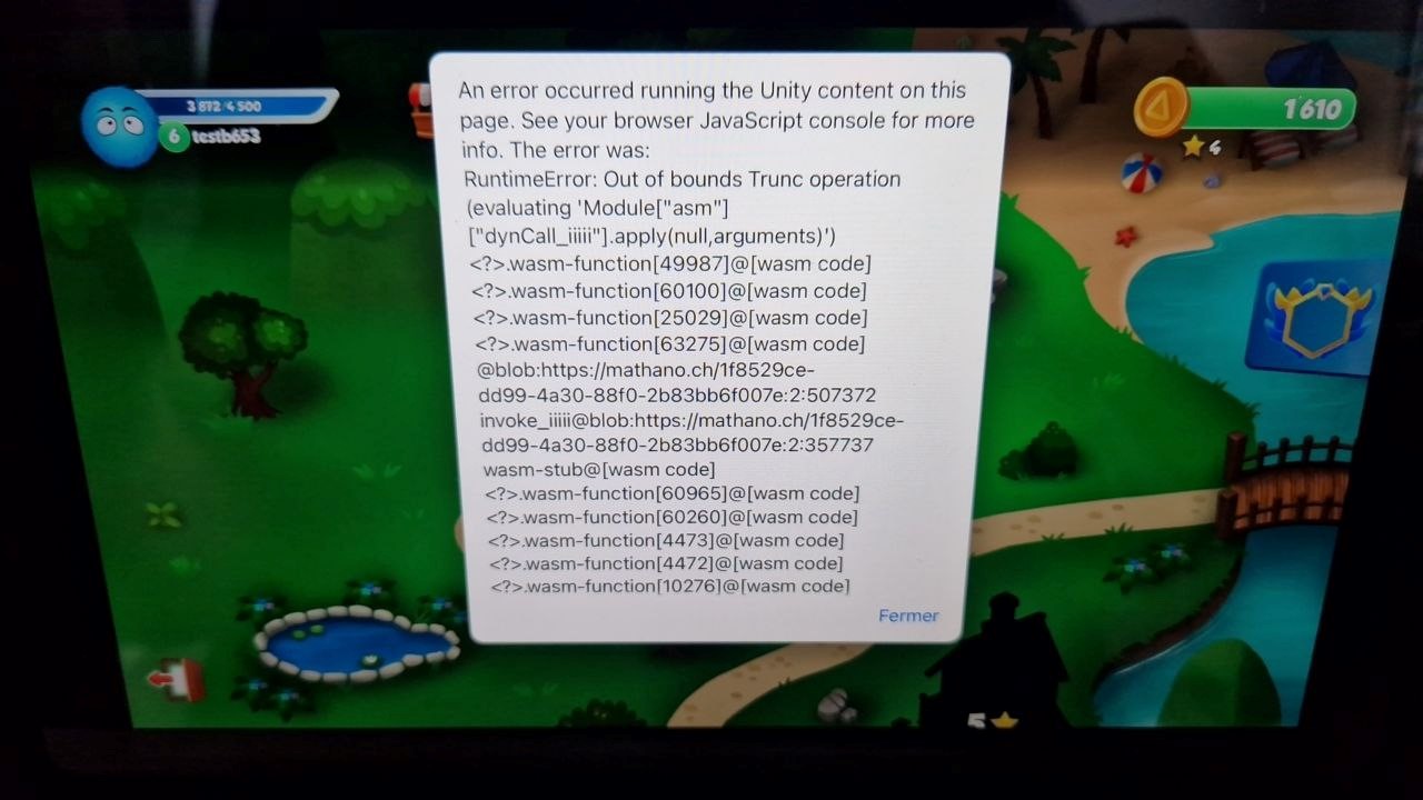 Cette mise à jour est très importante, j’ai enfin réussi à trouver la source d’un bug qui affectait énormément d’enfants qui jouaient sur des tablettes Apple. Et qui dit tablettes Apple, dit plus de 80% des cas pour la Suisse romande. C’était très long à trouver car ce n’est pas un problème de fonctionnement mais un problème de manipulation et de compatibilité entre Unity et IOS. Les élèves qui pinçaient l’écran (peut se produire même en ayant juste les deux pouces sur les côtés de l’écran) activaient la fonction « entrer dans la gestion des applications actives » d’IOS et c’est précisément ça qui faisait planter l’application en affichant cette erreur :