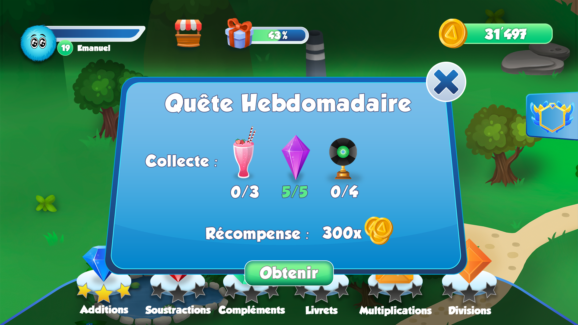 David a fait en sorte que la quantité et la variété des objets à collecter dépendent du degré scolaire de l’enfant. Les plus petits auront moins d’objets à collecter que les grands. En revanche, la récompense reste la même, peu importe le degré. Une fois que tous les objets sont collectés, les enfants reçoivent 300 pièces d’or en cliquant sur le bouton vert « Obtenir ». Les quêtes hebdomadaires sont réinitialisées tous les dimanches à 23h59.